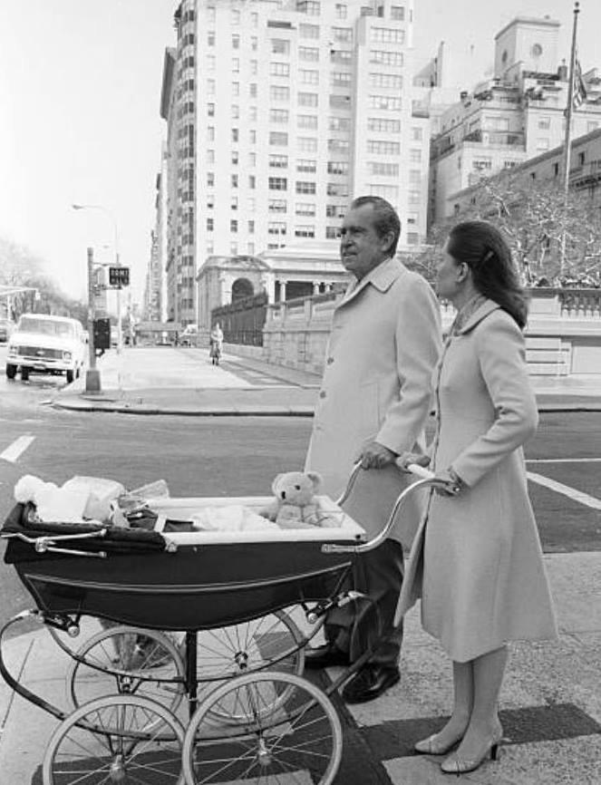 Richard M. Nixon escorts his daughter Julie from their Fifth Avenue