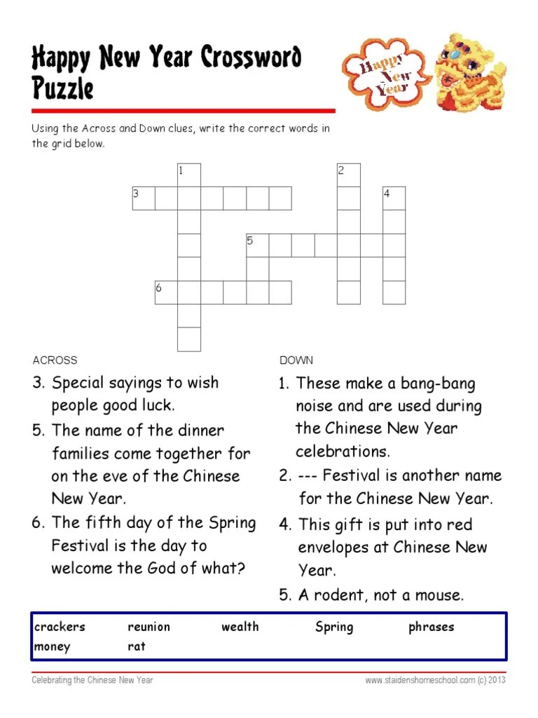 Chinese New Year Worksheet With Answer Key Crossword Puzzle PDF