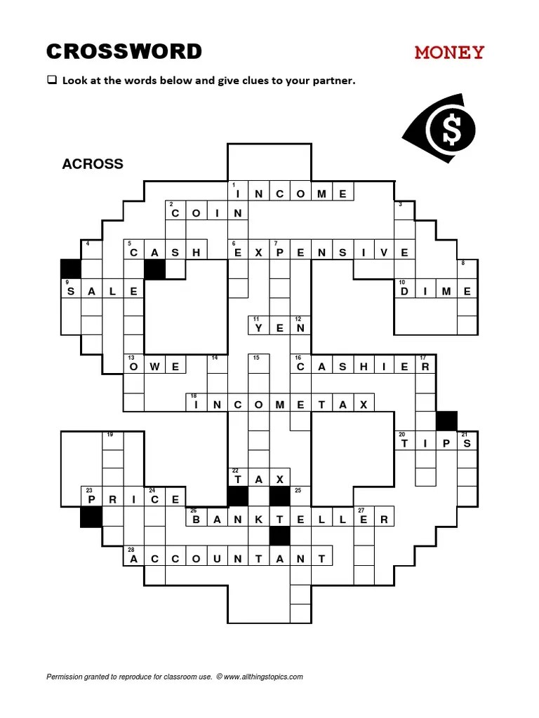 Printable Crossword Puzzle Money Printable Crossword Puzzles