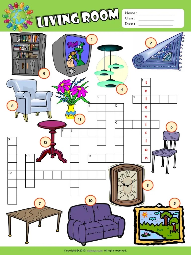 Free Printable Crossword Worksheet Game Topic Living Room For Kids ESL